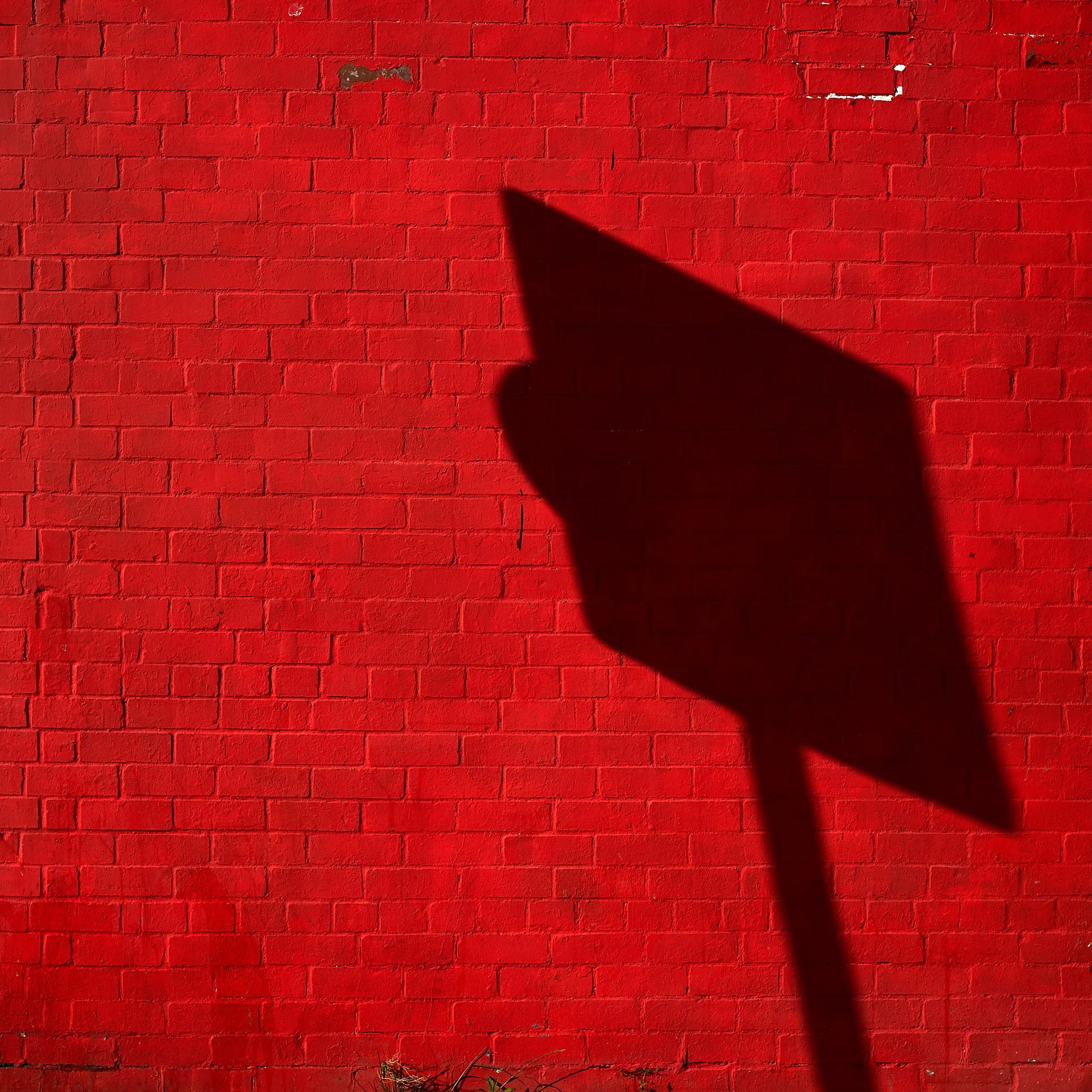 The red twenty zone - an evening summer shadow from a street sign cast against a brightly painted red wall in Dingle, Liverpool.